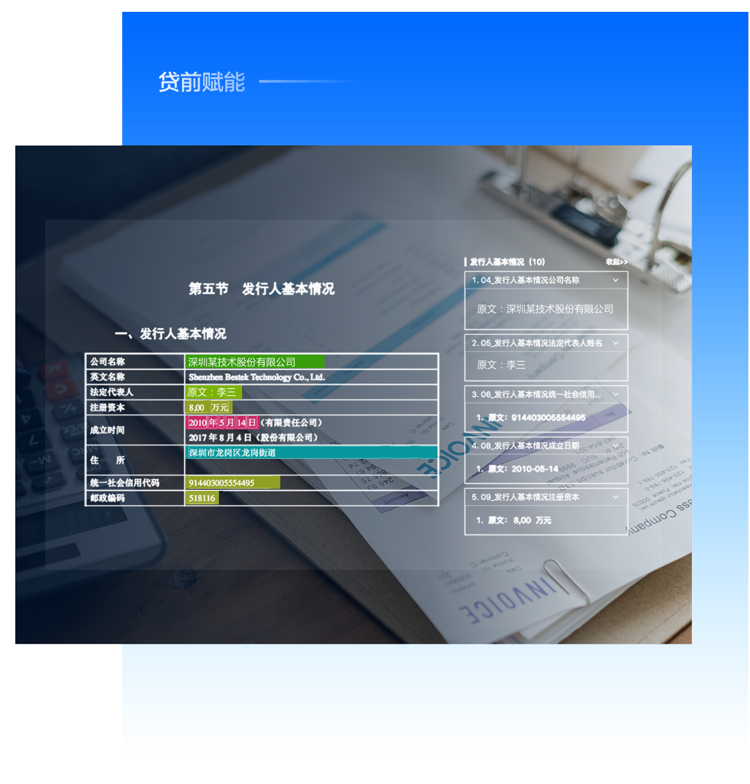 针对贷前审核材料种类多,格式多,篇幅长的痛点,实现材料格式结构化及人物、事件、组织、数值、条款等各类关键信息抽取,快速整合信息,提高审核效率